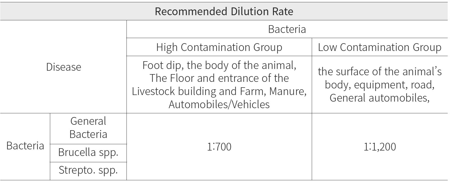 Disinfection of general bacteria(Salmonella spp.), Brucella spp., Streptococcus spp. and so on.