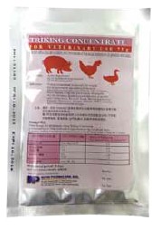 Triking Concentrate is specially developed for the prevention and control of bacterial infections such as infectious Coryza, CRD Complex, Fowl Cholera, Coliform Septicaemia, Salpingitis, Air-Sac diseases, Staphylococcal infection in poultry and Colibacilosis, Bacterial Scour, Bronchopneumonia, Enzootic Pneumonia, Atrophic Rhinitis, MMA complex and Colienterotoxaemia in pigs.